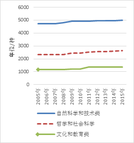 文化教育类期刊,2005年和2011年同比增长了23.68%和28.69%。哲学、社会科学类期刊2006-2012年一直处于增长态势,2011年同比增长达到峰值(16.12%),增幅较为明显。从2012年,学术类期刊总印数开始下滑,自然科学、技术类和文化教育类下滑较为明显,2014-2015年两类期刊分别下降了8.11%、7.13%和5.65%和9.21%。