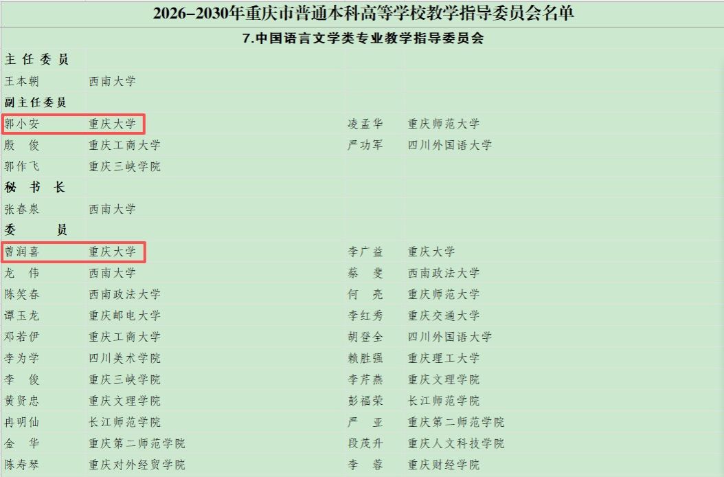 两位教授入选,郭小安院长任中国语言文学类专业教学指导委员会副主任委员,曾润喜副院长任该委员会委员。